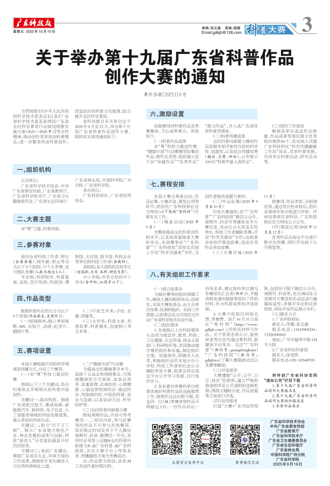 关于举办第十九届广东省科普作品 创作大赛的通知